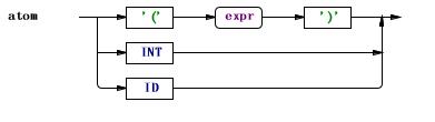 其中语法规则和词法记号的定义都有对应的图形表示方式。比如语法规则 atom 的图示形式 所示:
